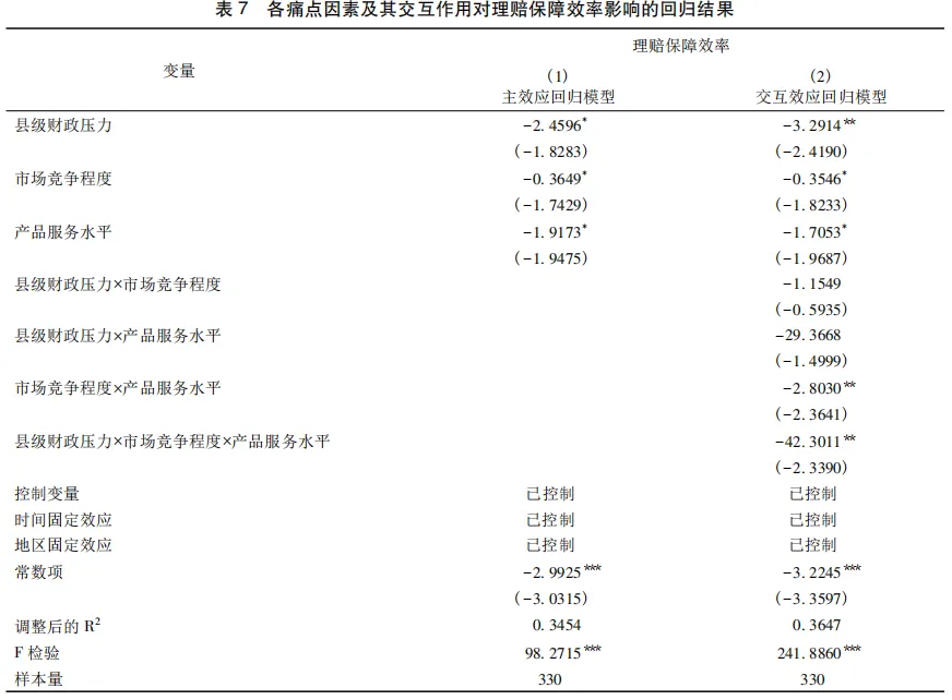 H4:财政补贴承压、市场竞争失序、产品服务粗放会对农业保险理赔保障效率产生负向影响,且其叠加作用将进一步强化负向影响效果。