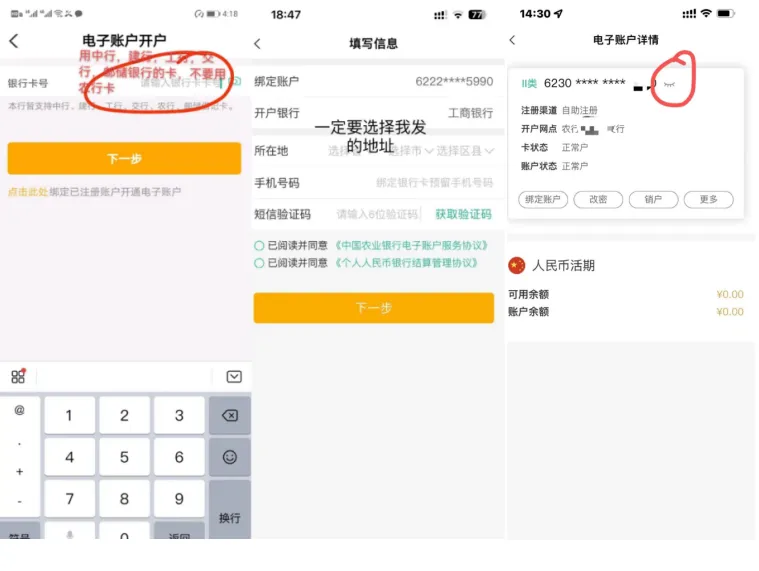 3. 绑定银行卡:这一步至关重要,需输入中、建、工、交、农、邮储任意一张银行一类卡信息。输入卡号、开户行等相关信息后,按照提示进行下一步操作。