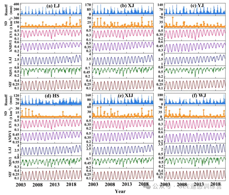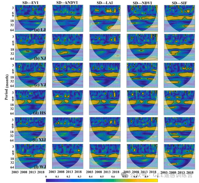 图 9.2003–2020 年 6 个喀斯特流域月输沙量(SD)与植被相关指标的小波相干性分析。黑色粗线表示 95% 置信区间;箭头方向表示相位关系;颜色表示能量密度相对变化。