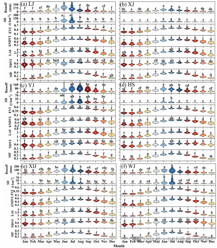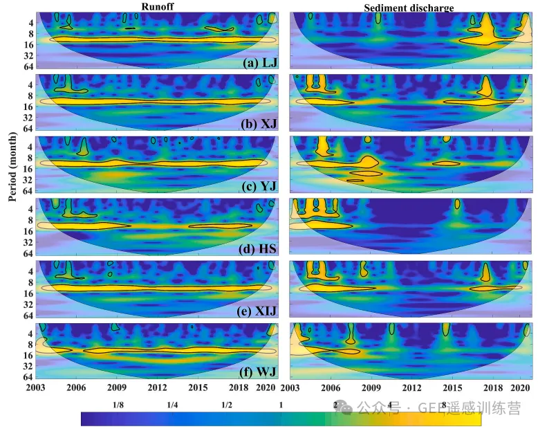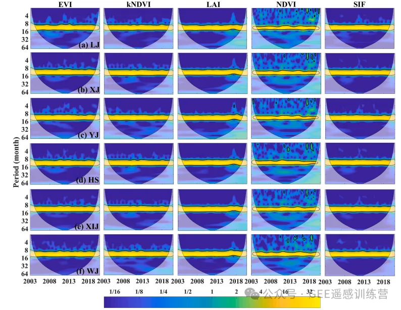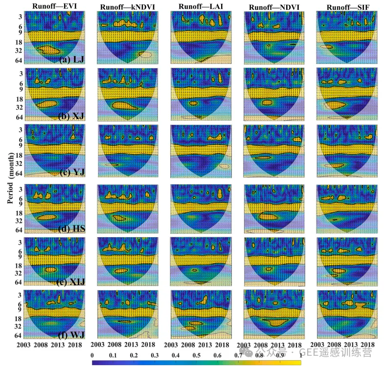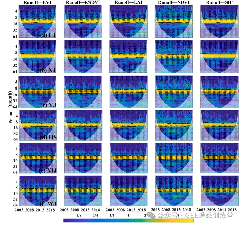 图 6. 2003–2020 年 6 个喀斯特流域月径流与植被相关指标的交叉小波变换分析。黑色粗线表示 95% 置信区间;箭头方向表示相位关系;颜色表示能量密度相对变化。
