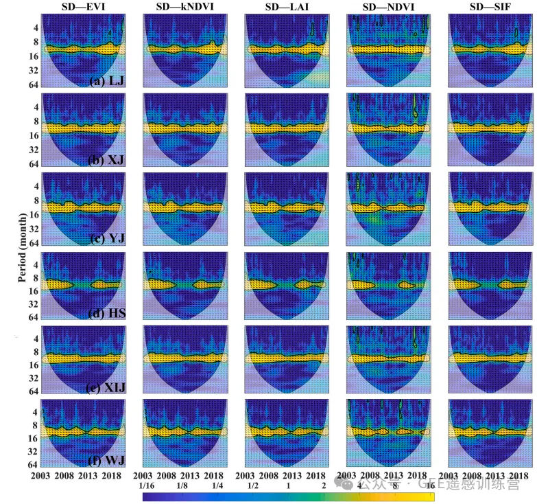 图 7.2003–2020 年 6 个喀斯特流域月输沙量(SD)与植被相关指标的交叉小波变换分析。黑色粗线表示 95% 置信区间;箭头方向表示相位关系;颜色表示能量密度相对变化。