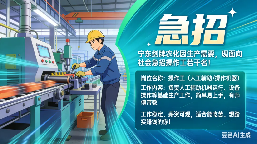 生产岗(操作工/造粒工)需适应倒班,年龄放宽至50岁,高中及以上学历即可;