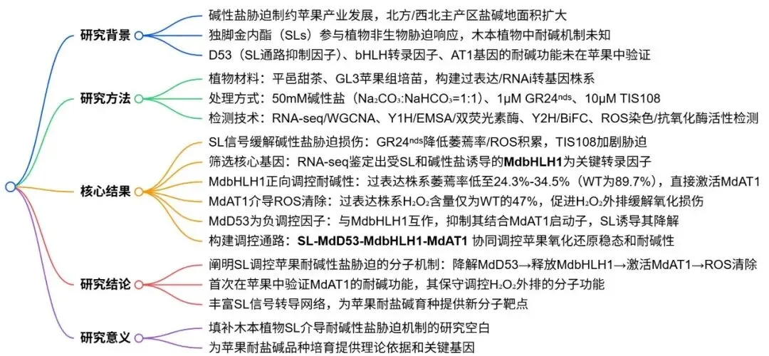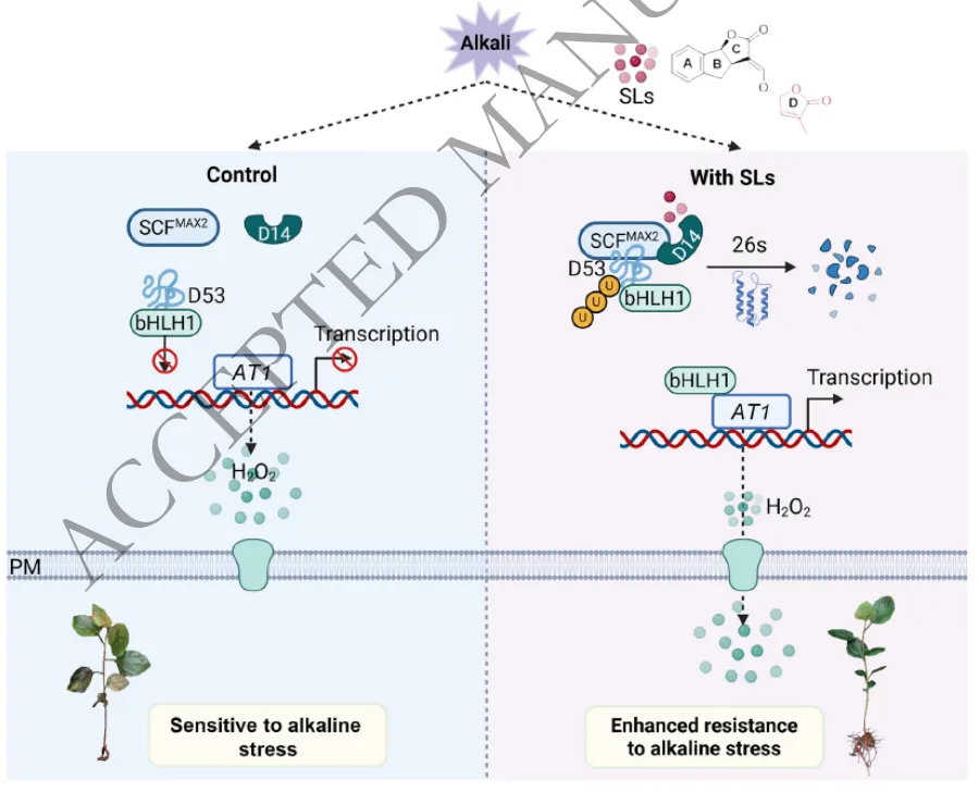 研究表明,外源施用独脚金内酯类似物GR245DS能够有效缓解盐碱胁迫对苹果幼苗造成的生长抑制和根系损伤。在生理层面,GR245DS通过显著提升SOD、POD和CAT等关键抗氧化酶的活性,上调耐碱基因MdAT1的表达,有效清除了体内过量积累的活性氧(H₂O₂和O₂·⁻),降低了膜脂过氧化程度,从而维持了细胞的氧化还原稳态和根际活力。相反,SL合成抑制剂TIS108则加剧了盐碱胁迫引起的氧化损伤和生长抑制。这些结果证实了SL信号通过协同激活内源抗氧化系统介导植物对盐碱胁迫的适应(Fig.1)。