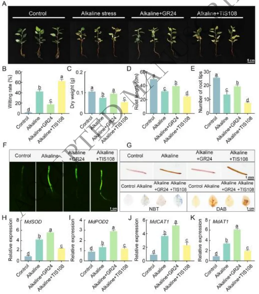 图1. 外源GR245DS和TIS108对盐碱胁迫下平邑甜茶幼苗生长和生理的影响。(A) 对照、盐碱胁迫以及GR245DS或TIS108处理下平邑甜茶幼苗的生长表型;(B) 萎蔫率;(C) 干生物量;(D) 总根长;(E) 根尖数。(F) 根系中ROS荧光信号;(G) 根际活力的TTC染色;叶片ROS检测的NBT和DAB染色;(H-K) 处理下抗氧化酶基因的相对表达水平:(H) MdSOD;(I) MdPOD2;(J) MdCAT1;(K) MdAT1。数据代表三个生物学重复的平均值 ± SD。不同小写字母表示根据Fisher的LSD检验具有显著性差异(P < 0.05)。比例尺:5 cm (A),1 cm (F),1 mm (G)。