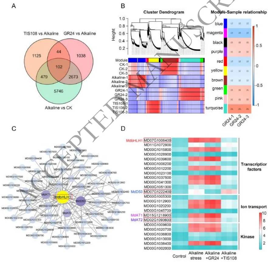 为解析SL信号在盐碱胁迫下的调控网络,研究对不同处理的苹果幼苗进行了转录组测序分析。通过差异表达基因筛选与共表达网络分析(WGCNA),鉴定出102个核心响应基因,这些基因主要参与代谢过程、膜转运及激素信号传导等通路。进一步整合分析发现,转录因子MdbHLH1是一个关键的枢纽基因,其表达不仅受到盐碱胁迫的强烈诱导,还能被GR245DS显著上调,而TIS108则抑制其表达。这表明MdbHLH1是SL介导苹果盐碱胁迫响应网络中的核心调控因子(Fig.2)。