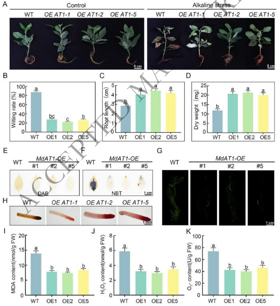 图4. MdAT1过表达增强耐碱性的表型和生理机制。(A) 对照(左)和胁迫(右)条件下WT和OE株系的表型;(B) 萎蔫率;(C) 干生物量;(D) 根长;(E) 检测H₂O₂积累的DAB染色;(F) 检测O₂·⁻积累的NBT染色;(G) 根系中ROS荧光信号;(H) 根际活力的TTC染色;(I) MDA含量的定量分析。(J) H₂O₂含量的定量分析;(K) O₂·⁻含量的定量分析。数据代表三个生物学重复的平均值 ± SD。不同小写字母表示根据Fisher的LSD检验具有显著性差异(P < 0.05)。比例尺:5 cm (A),1 cm (E/G),1 mm (H)。