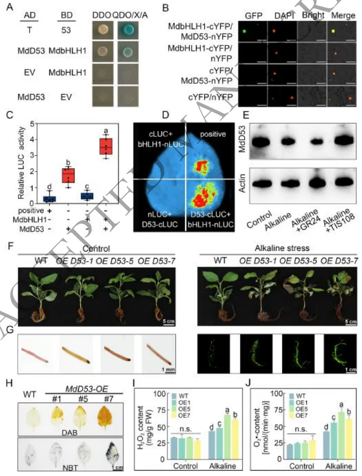 进一步的研究揭示了SL信号通路核心抑制因子MdD53在盐碱胁迫中的作用机制。多种分子互作试验(Y2H、BiFC、LCI等)一致证实,MdD53能够与转录因子MdbHLH1发生直接的物理相互作用。蛋白质水平分析发现,MdD53的丰度受SL信号的严格调控,外源SL可诱导其降解。在功能层面,过表达MdD53会导致苹果植株在盐碱胁迫下积累大量活性氧,加剧叶片坏死和生长抑制;而敲降MdD53则显著提升了植株的ROS清除能力和耐盐碱性。这表明MdD53通过与MdbHLH1互作并削弱ROS清除能力,在苹果耐盐碱胁迫中发挥负向调控作用(Fig.5)。