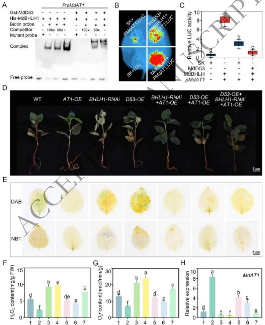 转录抑制:EMSA和双荧光素酶报告试验表明,MdD53的加入显著削弱了MdbHLH1对MdAT1启动子的结合能力及其转录激活作用,证实MdD53抑制了该调控途径。