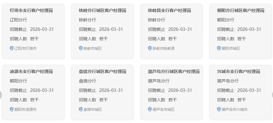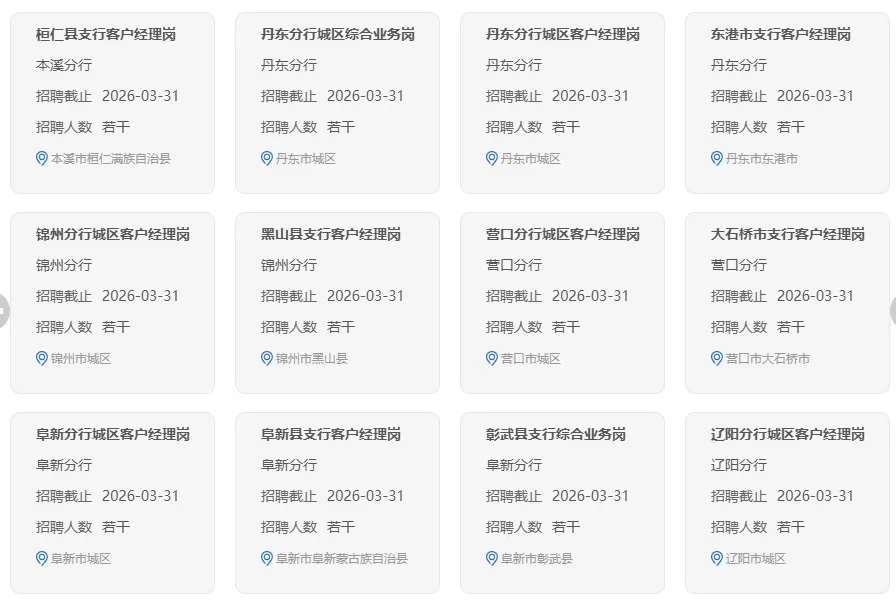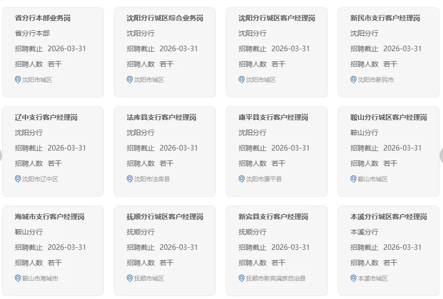 中国农业银行辽宁省分行是中国农业银行辖属一级分行。我们始终锚定服务乡村振兴领军银行、服务实体经济主力银行“两大定位”,不断提升经营能力,推动改革创新,优化金融供给,现已发展成为网络覆盖广、城乡联动强、客户基础好、企业文化优,能够为客户提供全方位金融服务的国有控股大型商业银行,在助力辽宁全面振兴中发挥了积极作用。我们牢牢坚守“德才兼备,以德为本,尚贤用能,绩效为先”的人才理念,热忱期待与您携手同行、共创辉煌!现将2026年度春季招聘有关事宜公告如下: