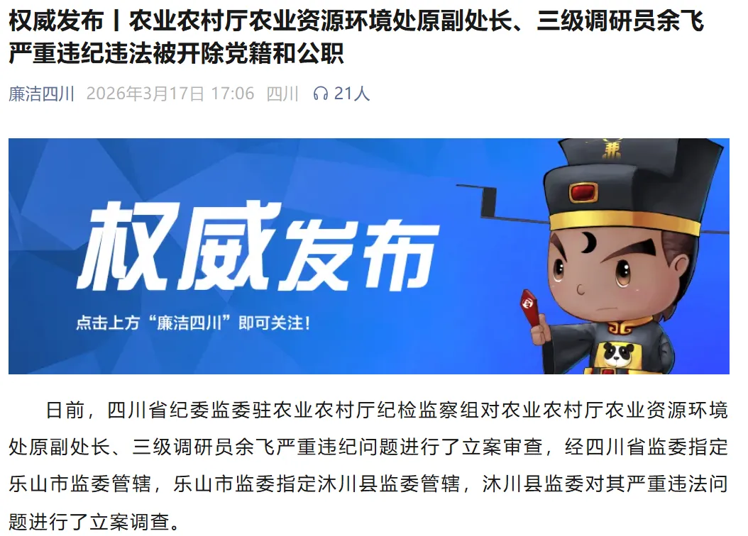 根据四川省纪委监委“廉洁四川”3月17日发布的消息,农业农村厅农业资源环境处原副处长、三级调研员余飞严重违纪违法被开除党籍和公职。