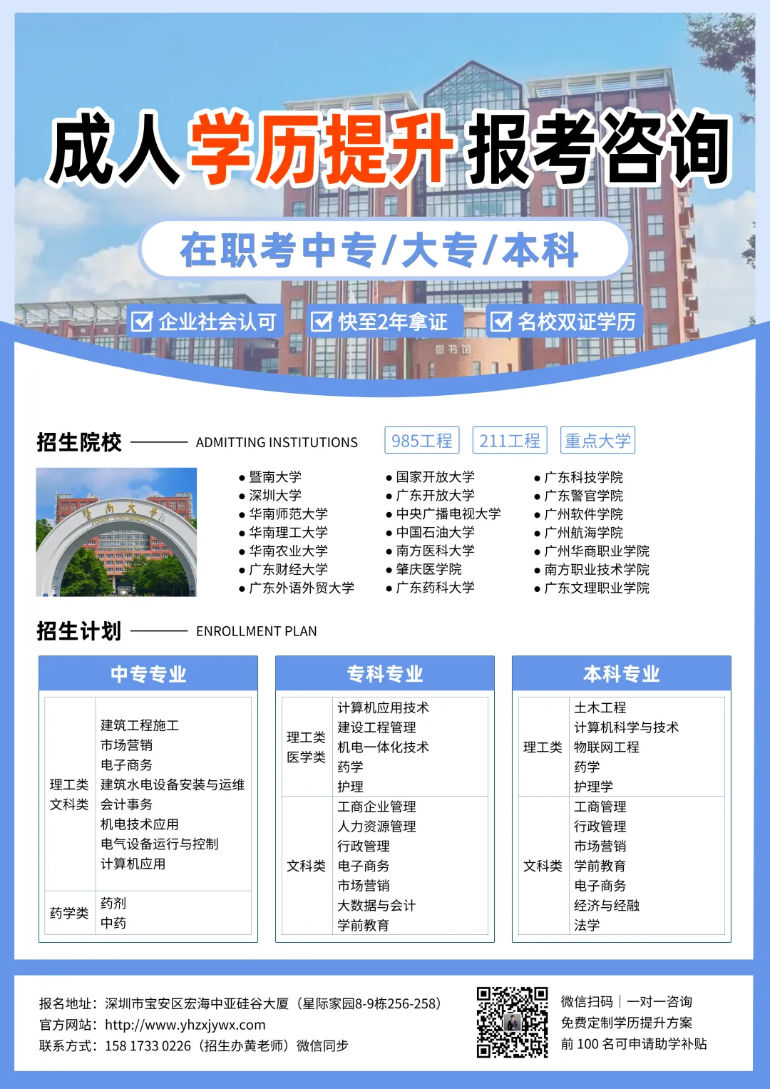 招生咨询热线:黄琙顺 199-2659-4813 (工作日9:00-18:00),官方微信公众号“盈汇在线教育”实时更新政策解读。