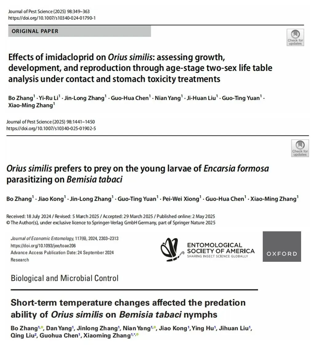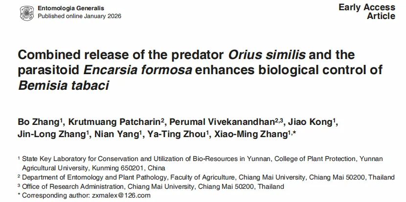 近日,云南农业大学植物保护学院张晓明教授团队在昆虫学国际顶刊Entomologia Generalis发表研究论文“Combined release of the predator Orius similis and the parasitoid Encarsia formosa enhances biological control of Bemisia tabaci”。2025届硕士研究生张薄为论文第一作者,张晓明教授为通讯作者,张金龙博士等参与研究,陈国华教授给予重要指导。研究表明,捕食性天敌南方小花蝽与寄生性天敌丽蚜小蜂联合释放,可显著提升对烟粉虱的生物防治效果,为农业害虫绿色防控提供了新的研究依据。