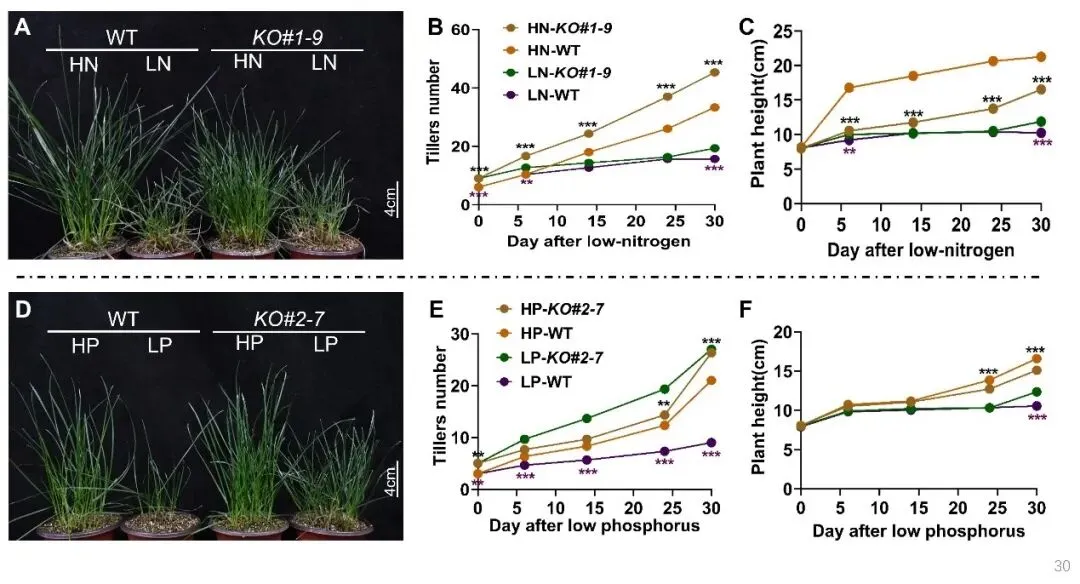 (A-C,基因编辑植株KO#1-9氮胁迫表型,HN/LN,正常/低氮环境;D-F,基因编辑植株KO#2-7磷胁迫表型,HP/ LP,正常/低磷环境;)