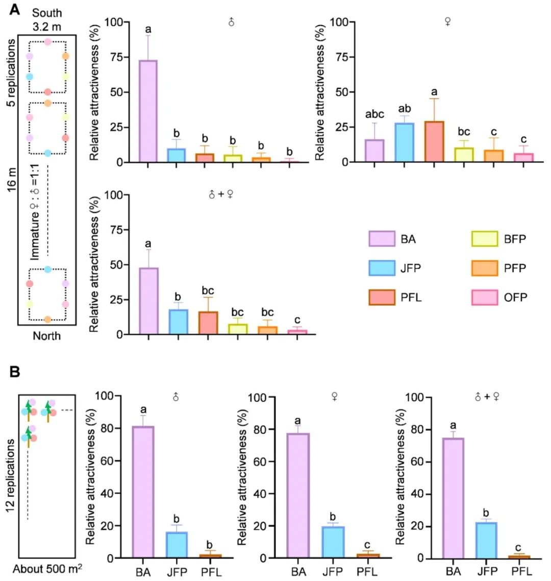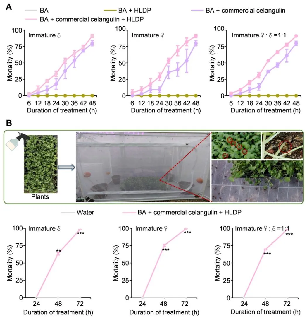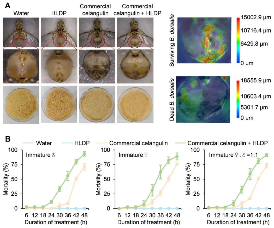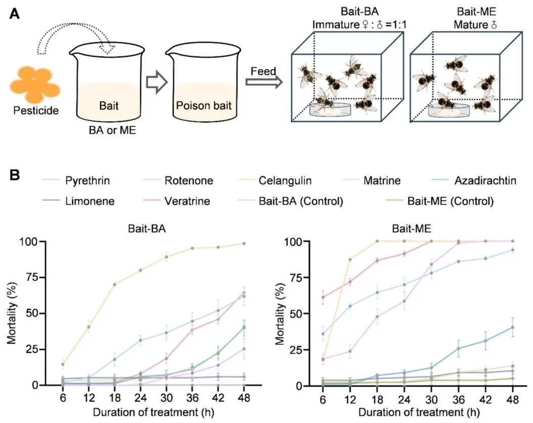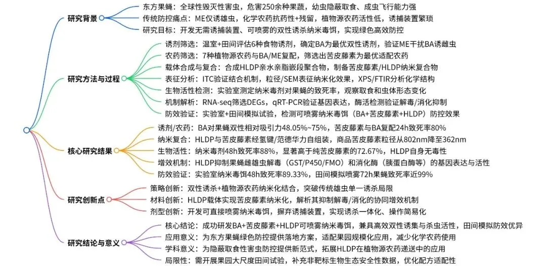 东方果蝇(桔小实蝇)是一种在亚洲、非洲、北美洲、南美洲及大洋洲广泛分布的世界性恶性毁灭性害虫,可对石榴、柑橘等约 250 种果蔬造成严重危害。其幼虫具有隐蔽取食的习性,雌雄成虫均具备出色的飞行能力,这些特性为该害虫的防控工作带来了极大困难。在东方果蝇的综合防控体系中,诱杀策略是备受青睐的替代方案。其中,植物源信息素甲基丁香酚是目前应用最广泛的诱剂,雄虫取食掺有杀剂的甲基丁香酚后会被诱杀。研究发现,雄虫取食甲基丁香酚后,体内会合成高效性信息素,进而增强其求偶行为,提升成熟雄虫的交配竞争力。但这类专性诱杀雄虫的诱剂存在明显短板:雌雄果蝇均能多次交配,且已交配的雌虫可迁入施药区域继续产卵危害,导致诱杀效果大打折扣。将高效杀剂与双性诱剂结合,可研发出无需配套诱捕装置、直接喷雾使用的毒饵,大幅简化防控操作。当前防控中使用的化学合成杀剂存在诸多弊端:长期高强度使用易使靶标害虫产生广泛抗药性,且农药残留会严重危害人体健康,同时对非靶标生物造成不良影响。作为可持续防控东方果蝇的替代杀剂,环境友好型植物源农药因能减少农药施用量,近年来受到越来越多的关注。除虫菊素、印楝素、鱼藤酮、柠檬烯、苦参碱、藜芦碱、苦皮藤素等植物源农药,因具有高选择性和环境友好的特点,已被广泛应用于多种农林害虫的防控,但这类农药存在急性毒性较低、持效期短于化学合成农药的局限性。因此,研发创新技术克服上述缺陷、提升植物源农药的防控效能,以满足实际生产需求,已成为亟待解决的问题。该研究团队设计并合成了一种兼具亲水和疏水基团的亲水亲脂嵌段聚合物(HLDP),该聚合物能通过疏水作用、静电作用等多种方式与各类外源物质发生相互作用。与此前报道的星型聚阳离子纳米载体相比,亲水亲脂嵌段聚合物的疏水性更强,更适合负载疏水性药剂。该研究围绕双性诱杀策略展开,旨在研发一种可喷雾的纳米毒饵,用于防控破坏性东方果蝇。研究首先在温室和田间条件下对 6 种食物诱剂进行筛选,筛选出对雌雄虫均有诱集作用的细菌剂,并将其与专性诱雄剂甲基丁香酚进行实验室和田间对比验证;随后将 7 种植物源农药分别与细菌剂或甲基丁香酚复配,制备系列毒饵,筛选出与两种诱剂复配后均表现出优异杀虫效果的苦皮藤素;接着将纯品苦皮藤素和商品苦皮藤素包封于亲水亲脂嵌段聚合物纳米载体中,制备苦皮藤素 / 亲水亲脂嵌段聚合物复合物及纳米毒剂(商品苦皮藤素 + 亲水亲脂嵌段聚合物),并通过等温滴定量热法、粒径分析和形貌表征对其进行检测;重点在实验室条件下测定了纳米毒剂及其毒饵制剂对东方果蝇初羽化成虫的生物活性;为阐明纳米毒剂生物活性增强的潜在机制,对处理后的雌雄果蝇进行转录组测序分析,并通过实时荧光定量 PCR 和酶活测定实验对测序结果进行验证;最后通过田间模拟喷雾试验,检测了可喷雾纳米毒饵(细菌剂 + 商品苦皮藤素 + 亲水亲脂嵌段聚合物)的田间防控效果。本研究首次将纳米载体应用于双性诱剂与植物源农药的组合体系,研发出可喷雾纳米毒饵,为农林害虫的可持续绿色防控提供了一种创新策略。图1为六种食物诱剂在温室(A)和田间(B)条件下对东方果蝇的相对吸引力检测结果,温室试验中释放 1:1 性比的初羽化果蝇,24h 统计发现细菌剂(BA)、枣果粉(JFP)、石榴发酵液(PFL)为吸引力前三的诱剂,其中 BA 对雌雄虫整体相对吸引力达 48.05%,显著高于香蕉果粉、石榴果粉、橙果粉等其他诱剂;后续在约 500 m² 的石榴园开展的田间试验进一步验证,BA 对东方果蝇雌雄虫的诱集效果均为最优,对雌雄虫整体相对吸引力高达 75%,其中对雌虫的相对吸引力达 77.63%,远优于 JFP 和 PFL,明确了 BA 是兼具高效双性诱集活性的最优候选诱剂。图2为双性诱剂细菌剂(BA)与专性诱雄剂甲基丁香酚(ME)在田间(A-C)和实验室(D)条件下对东方果蝇的诱集效果检测结果,田间试验经 1 个月、每 5 天一次的统计发现,ME 虽能提升 BA 对雄虫的诱集能力,但会显著降低 BA 对雌虫的诱集效果,二者复配并未产生双性诱集的协同作用;实验室笼养验证试验进一步证实,与单独使用 BA 相比,BA+ME 组合对雌虫的诱捕数量从 30.5 大幅降至 19.8,明确了 ME 会干扰 BA 对雌虫的诱集作用,因此田间应用中单独使用 BA 能实现更优的双性诱杀效果。图3为七种植物源农药与双性诱剂 BA、专性诱雄剂 ME 复配制备毒饵后对东方果蝇的致死效果检测结果,实验将七种农药分别稀释后与 BA/ME 复配制成毒饵,对 BA 毒饵采用 1:1 性比的初羽化果蝇、对 ME 毒饵采用成熟雄虫开展致死性检测并设置无农药的纯诱剂为对照;结果显示,在所有复配毒饵中,苦皮藤素与 BA/ME 复配后的杀虫活性均为最强,其中苦皮藤素 + BA 复配毒饵对初羽化雌雄果蝇 24h 致死率达 80%,且该复配方式还能产生协同效应,在降低苦皮藤素使用浓度的同时提升果蝇死亡率,证实苦皮藤素是与诱剂适配的最优植物源农药。图4为苦皮藤素与 HLDP 的自组装机制及二者相互作用的等温滴定量热法(ITC)分析结果,其中 A 图直观展示了苦皮藤素与 HLDP 通过氢键和范德华力自发组装形成苦皮藤素 / HLDP 复合物的过程;B 图的 ITC 检测数据显示,二者结合的亲和常数达 3.250×10⁵ M⁻¹、解离常数仅为 3.077×10⁻⁶ M,证明相互作用结合力强,且吉布斯自由能变(ΔG)为 - 31.658 kJ