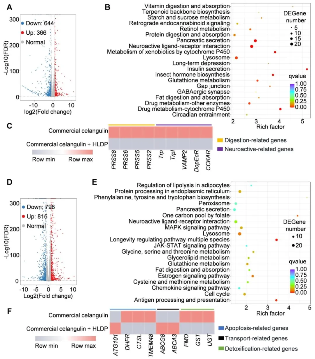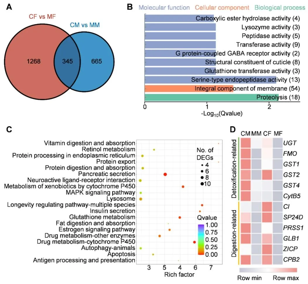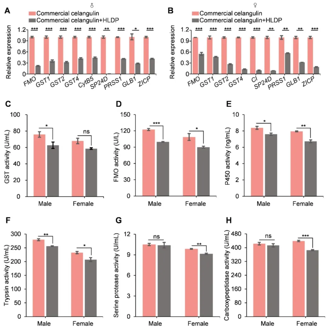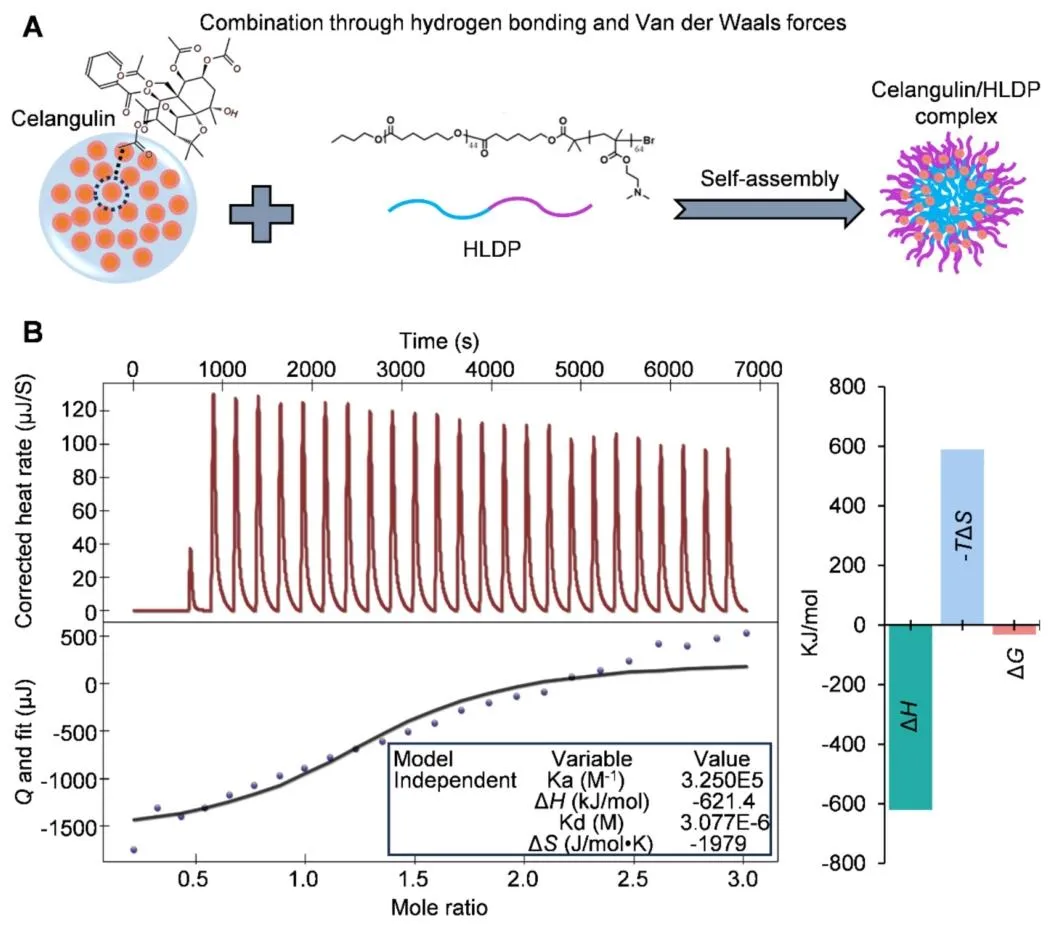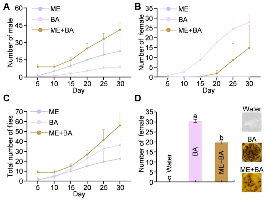 东方果蝇(桔小实蝇)是一种在亚洲、非洲、北美洲、南美洲及大洋洲广泛分布的世界性恶性毁灭性害虫,可对石榴、柑橘等约 250 种果蔬造成严重危害。其幼虫具有隐蔽取食的习性,雌雄成虫均具备出色的飞行能力,这些特性为该害虫的防控工作带来了极大困难。在东方果蝇的综合防控体系中,诱杀策略是备受青睐的替代方案。其中,植物源信息素甲基丁香酚是目前应用最广泛的诱剂,雄虫取食掺有杀剂的甲基丁香酚后会被诱杀。研究发现,雄虫取食甲基丁香酚后,体内会合成高效性信息素,进而增强其求偶行为,提升成熟雄虫的交配竞争力。但这类专性诱杀雄虫的诱剂存在明显短板:雌雄果蝇均能多次交配,且已交配的雌虫可迁入施药区域继续产卵危害,导致诱杀效果大打折扣。将高效杀剂与双性诱剂结合,可研发出无需配套诱捕装置、直接喷雾使用的毒饵,大幅简化防控操作。当前防控中使用的化学合成杀剂存在诸多弊端:长期高强度使用易使靶标害虫产生广泛抗药性,且农药残留会严重危害人体健康,同时对非靶标生物造成不良影响。作为可持续防控东方果蝇的替代杀剂,环境友好型植物源农药因能减少农药施用量,近年来受到越来越多的关注。除虫菊素、印楝素、鱼藤酮、柠檬烯、苦参碱、藜芦碱、苦皮藤素等植物源农药,因具有高选择性和环境友好的特点,已被广泛应用于多种农林害虫的防控,但这类农药存在急性毒性较低、持效期短于化学合成农药的局限性。因此,研发创新技术克服上述缺陷、提升植物源农药的防控效能,以满足实际生产需求,已成为亟待解决的问题。该研究团队设计并合成了一种兼具亲水和疏水基团的亲水亲脂嵌段聚合物(HLDP),该聚合物能通过疏水作用、静电作用等多种方式与各类外源物质发生相互作用。与此前报道的星型聚阳离子纳米载体相比,亲水亲脂嵌段聚合物的疏水性更强,更适合负载疏水性药剂。该研究围绕双性诱杀策略展开,旨在研发一种可喷雾的纳米毒饵,用于防控破坏性东方果蝇。研究首先在温室和田间条件下对 6 种食物诱剂进行筛选,筛选出对雌雄虫均有诱集作用的细菌剂,并将其与专性诱雄剂甲基丁香酚进行实验室和田间对比验证;随后将 7 种植物源农药分别与细菌剂或甲基丁香酚复配,制备系列毒饵,筛选出与两种诱剂复配后均表现出优异杀虫效果的苦皮藤素;接着将纯品苦皮藤素和商品苦皮藤素包封于亲水亲脂嵌段聚合物纳米载体中,制备苦皮藤素 / 亲水亲脂嵌段聚合物复合物及纳米毒剂(商品苦皮藤素 + 亲水亲脂嵌段聚合物),并通过等温滴定量热法、粒径分析和形貌表征对其进行检测;重点在实验室条件下测定了纳米毒剂及其毒饵制剂对东方果蝇初羽化成虫的生物活性;为阐明纳米毒剂生物活性增强的潜在机制,对处理后的雌雄果蝇进行转录组测序分析,并通过实时荧光定量 PCR 和酶活测定实验对测序结果进行验证;最后通过田间模拟喷雾试验,检测了可喷雾纳米毒饵(细菌剂 + 商品苦皮藤素 + 亲水亲脂嵌段聚合物)的田间防控效果。本研究首次将纳米载体应用于双性诱剂与植物源农药的组合体系,研发出可喷雾纳米毒饵,为农林害虫的可持续绿色防控提供了一种创新策略。图1为六种食物诱剂在温室(A)和田间(B)条件下对东方果蝇的相对吸引力检测结果,温室试验中释放 1:1 性比的初羽化果蝇,24h 统计发现细菌剂(BA)、枣果粉(JFP)、石榴发酵液(PFL)为吸引力前三的诱剂,其中 BA 对雌雄虫整体相对吸引力达 48.05%,显著高于香蕉果粉、石榴果粉、橙果粉等其他诱剂;后续在约 500 m² 的石榴园开展的田间试验进一步验证,BA 对东方果蝇雌雄虫的诱集效果均为最优,对雌雄虫整体相对吸引力高达 75%,其中对雌虫的相对吸引力达 77.63%,远优于 JFP 和 PFL,明确了 BA 是兼具高效双性诱集活性的最优候选诱剂。图2为双性诱剂细菌剂(BA)与专性诱雄剂甲基丁香酚(ME)在田间(A-C)和实验室(D)条件下对东方果蝇的诱集效果检测结果,田间试验经 1 个月、每 5 天一次的统计发现,ME 虽能提升 BA 对雄虫的诱集能力,但会显著降低 BA 对雌虫的诱集效果,二者复配并未产生双性诱集的协同作用;实验室笼养验证试验进一步证实,与单独使用 BA 相比,BA+ME 组合对雌虫的诱捕数量从 30.5 大幅降至 19.8,明确了 ME 会干扰 BA 对雌虫的诱集作用,因此田间应用中单独使用 BA 能实现更优的双性诱杀效果。图3为七种植物源农药与双性诱剂 BA、专性诱雄剂 ME 复配制备毒饵后对东方果蝇的致死效果检测结果,实验将七种农药分别稀释后与 BA/ME 复配制成毒饵,对 BA 毒饵采用 1:1 性比的初羽化果蝇、对 ME 毒饵采用成熟雄虫开展致死性检测并设置无农药的纯诱剂为对照;结果显示,在所有复配毒饵中,苦皮藤素与 BA/ME 复配后的杀虫活性均为最强,其中苦皮藤素 + BA 复配毒饵对初羽化雌雄果蝇 24h 致死率达 80%,且该复配方式还能产生协同效应,在降低苦皮藤素使用浓度的同时提升果蝇死亡率,证实苦皮藤素是与诱剂适配的最优植物源农药。图4为苦皮藤素与 HLDP 的自组装机制及二者相互作用的等温滴定量热法(ITC)分析结果,其中 A 图直观展示了苦皮藤素与 HLDP 通过氢键和范德华力自发组装形成苦皮藤素 / HLDP 复合物的过程;B 图的 ITC 检测数据显示,二者结合的亲和常数达 3.250×10⁵ M⁻¹、解离常数仅为 3.077×10⁻⁶ M,证明相互作用结合力强,且吉布斯自由能变(ΔG)为 - 31.658 kJ