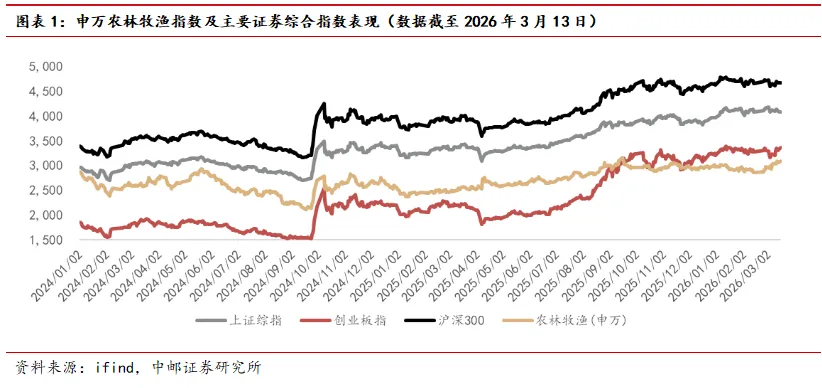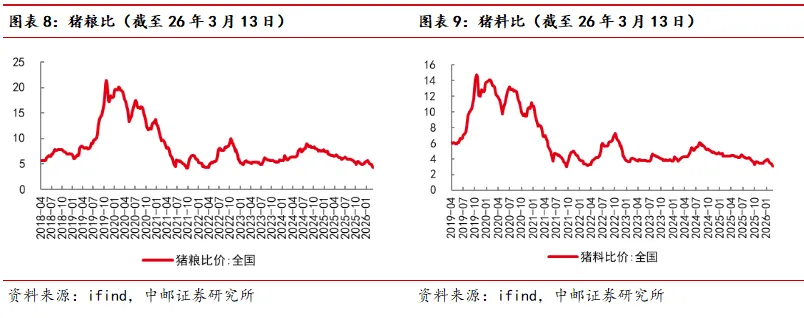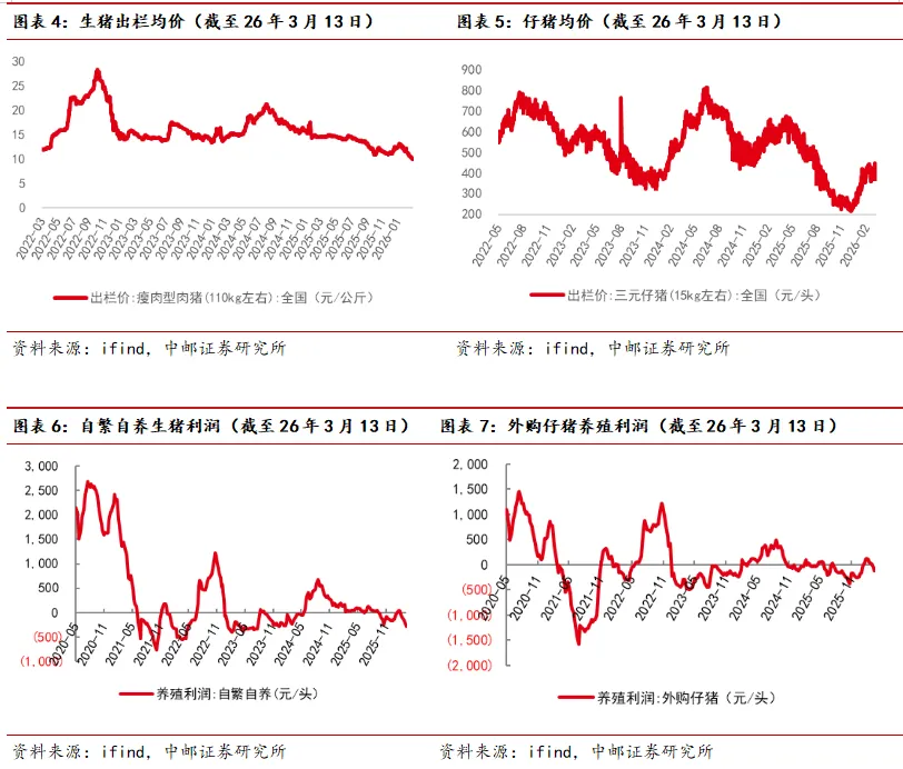 当前为消费淡季,但生猪供应量仍大,猪价承压持续下行。截至3月13日,全国生猪均价为10.09元/公斤,创下2019年1月以来最低值,广西、东北三省等地已跌破10元/公斤大关。从周内节奏看,猪价持续缓跌,国储虽然启动,但是承接有限。从产能来推算,26年上半年生猪供应压力仍大。清明节前后,需求季节性改善,将对猪价有所支撑,但供大于求的格局短期难以改变,猪价依然面临较大压力。