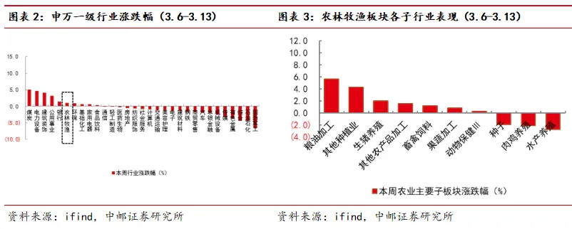 本周农业板块避险属性体现,农业指数跑赢大盘。本周沪深300指数小幅上涨0.19%、上证综指则下跌0.70%;而农林牧渔(申万)指数则累计上涨1.01%,在申万31个一级行业中排名第6位。