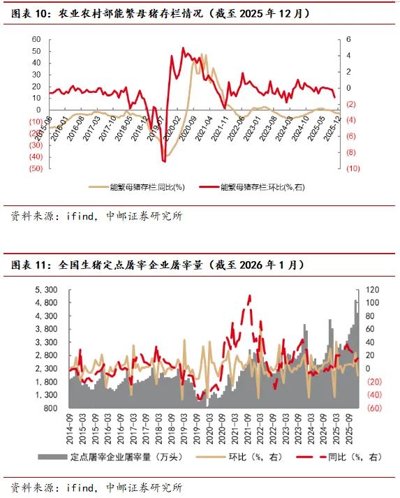 产能去化有望加速,26年下半年或进入新一轮周期。行业已全面亏损超过一个月,且亏损面积不断扩大。按照产能和仔猪推算,26年上半年,生猪供应压力依然很大,猪价依然面临着较大下行压力。若猪价持续低于11元/公斤,后续生猪产能被动去化持续。进一步看,2025年5月后行业产能开始去化,对应着2026年下半年开始,供应将减少,猪价或将进入新一轮上行周期,而周期高度则需密切关注26年上半年生猪产能进一步去化的程度。