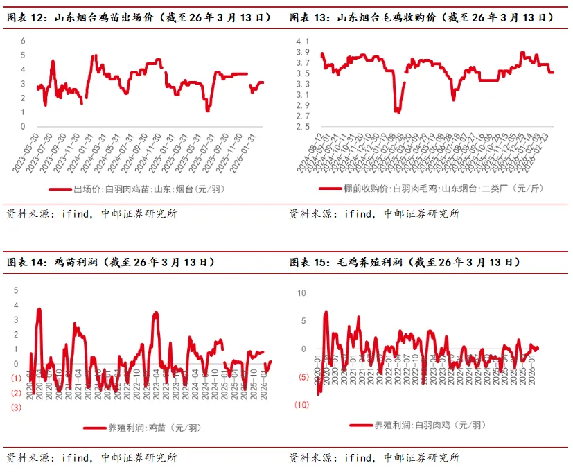 截至3月13日,烟台鸡苗均价3.1元/羽,与上周基本持平。毛鸡价格则再度下跌,烟台毛鸡价格为3.52元/斤,较节前跌0.05元/斤。主因供应量不大,孵化场排产较少,苗价相对稳定。
