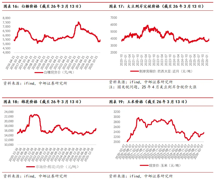 棉花:小幅上涨。截至26年3月13日,棉花价格为16851元/吨,较上周小幅涨1.5%。