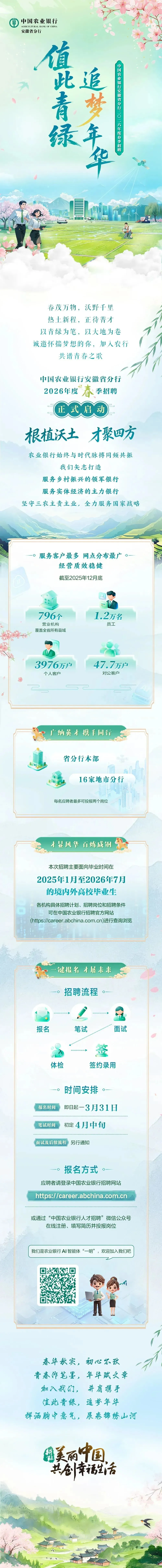 值此青绿 追梦年华 | 中国农业银行安徽省分行2026年度春季招聘正式启动