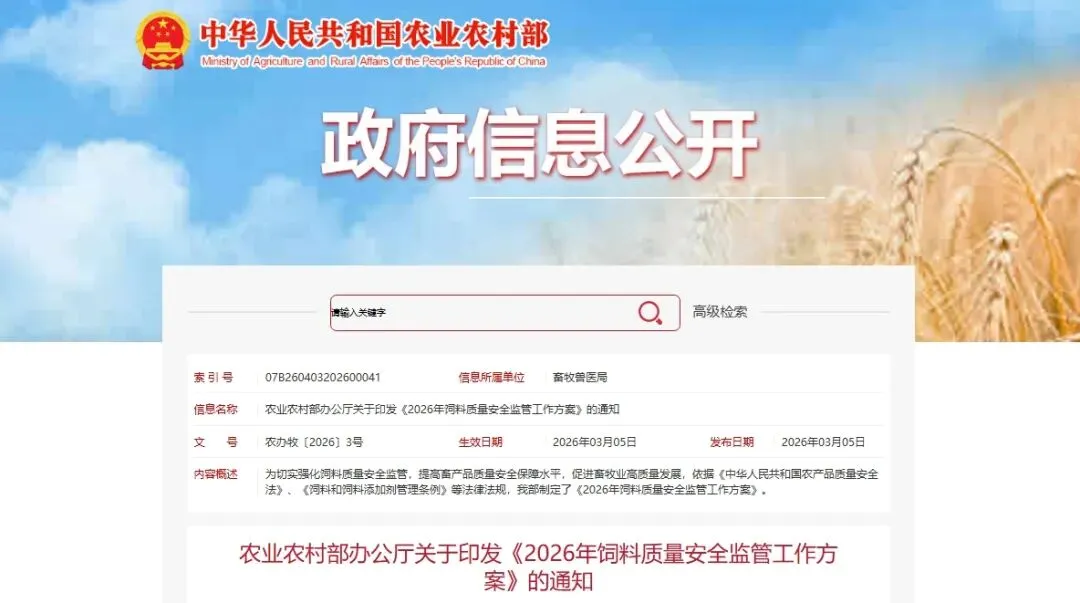 为切实强化饲料质量安全监管,提高畜产品质量安全保障水平,促进畜牧业高质量发展,依据《中华人民共和国农产品质量安全法》、《饲料和饲料添加剂管理条例》等法律法规,农业农村部制定了《2026年饲料质量安全监管工作方案》。现印发你们,请结合实际抓好落实。