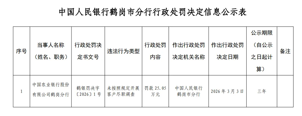 中国人民银行鹤岗市分行行政处罚决定信息公示表显示,中国农业银行股份有限公司鹤岗分行因未按照规定开展客户尽职调查,被罚款25.05万元。