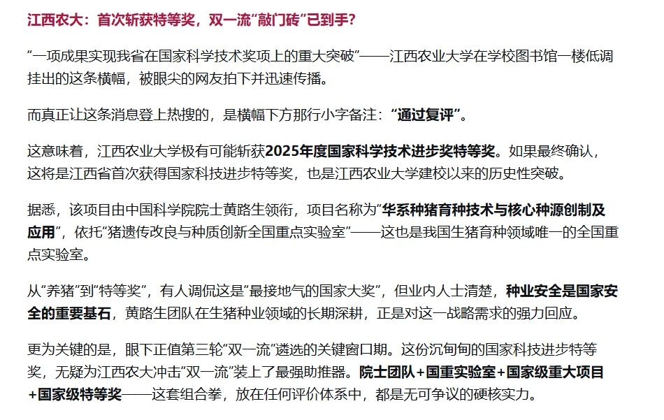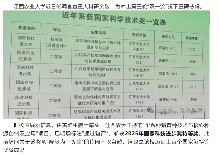 2026年3月,江西农业大学图书馆一楼悄然更新的一则展板信息,在江西高教界激起千层浪。展板显示,由该校党委书记、中国科学院院士黄路生作为第一完成人牵头的项目“华系种猪育种技术与核心种源创制及应用”,已正式通过2025年度国家科学技术进步奖特等奖复评。这一消息坐实了此前2025年9月国家奖励办初评公示的结果,意味着江西农业大学即将捧回江西省历史上首个国家科技进步特等奖。