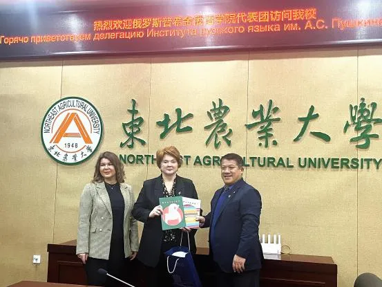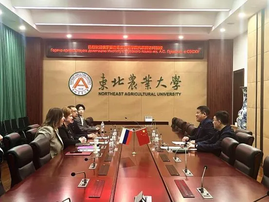 2026年3月17日,正值2026—2027中俄教育年启幕之际,俄罗斯普希金国立俄语学院副院长帕弗里切娃·叶列娜·尼古拉耶夫娜,院长助理瓦西纳·达利亚·阿列克谢耶夫娜一行2人访问东北农业大学。我校国际交流合作处处长卢铁光、副处长迟勇及相关科室负责人热情接待了代表团一行。座谈会由迟勇副处长主持。