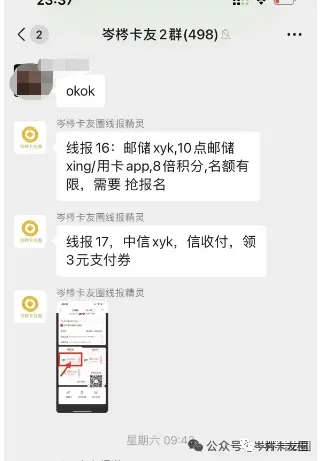 很多及时性的线报,我们都会第一时间发到卡友群,微信社群是最快最有效的传播方式。