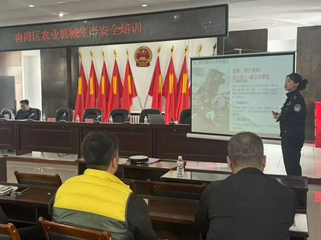 哈尔滨市公安局交通管理支队南岗大队宣教人员结合典型事故案例,重点讲解农机道路通行规则、违法载人、疲劳驾驶、夜间作业安全等内容,以案释法、以案警示,进一步强化农机从业人员交通安全意识和守法自觉性。 培训结束后,区农业农村局工作人员与交管大队宣教人员一同深入农机作业现场,开展实地安全讲解与实操指导,针对农机作业、上路行驶、安全防护等关键环节进行面对面答疑、点对点提醒,把安全服务延伸到春耕生产一线。 活动现场,工作人员向参训人员发放农机安全宣传材料200余份、农机反光贴100余贴,切实提升农机夜间行驶和田间作业安全防护水平。此次活动将集中培训、政策宣讲、实地指导有机结合,内容务实、贴近生产、针对性强,有效提升了辖区农机从业人员安全操作技能和政策知晓度,为南岗区春耕生产有序推进、全力守住农机安全生产底线提供了有力保障。