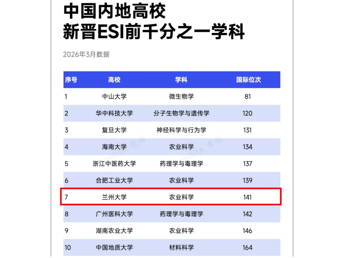 3月12日,国际权威学术评价机构科睿唯安(Clarivate Analytics)公布了2026年3月的ESI最新数据(数据覆盖时间范围为2015年1月到2025年12月),兰州大学农业科学学科进入全球前1‰学科。截至目前,兰州大学共有18个学科进入ESI全球排名前1%,其中化学、环境科学与生态学、农业科学3个学科进入ESI全球排名前1‰。学校排名362位,较2025年3月提升23位,学校的科研实力与国际影响力进一步提升。作为全球公认的科研绩效评价权威指标,ESI数据库通过论文影响力、研究前沿性等六大核心维度,系统评估学科的国际竞争力。据统计,本期中国内地共有136所高校的453个学科跻身ESI前1‰学科,19所高校共新增19个前1‰学科。