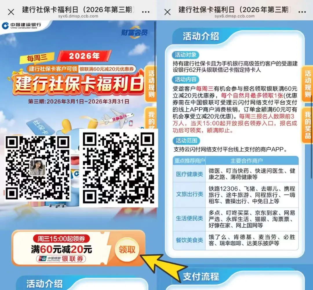 需要建行社保卡(储蓄卡)参与,满60元立减20元,可以充电费、充话费、买京东e卡