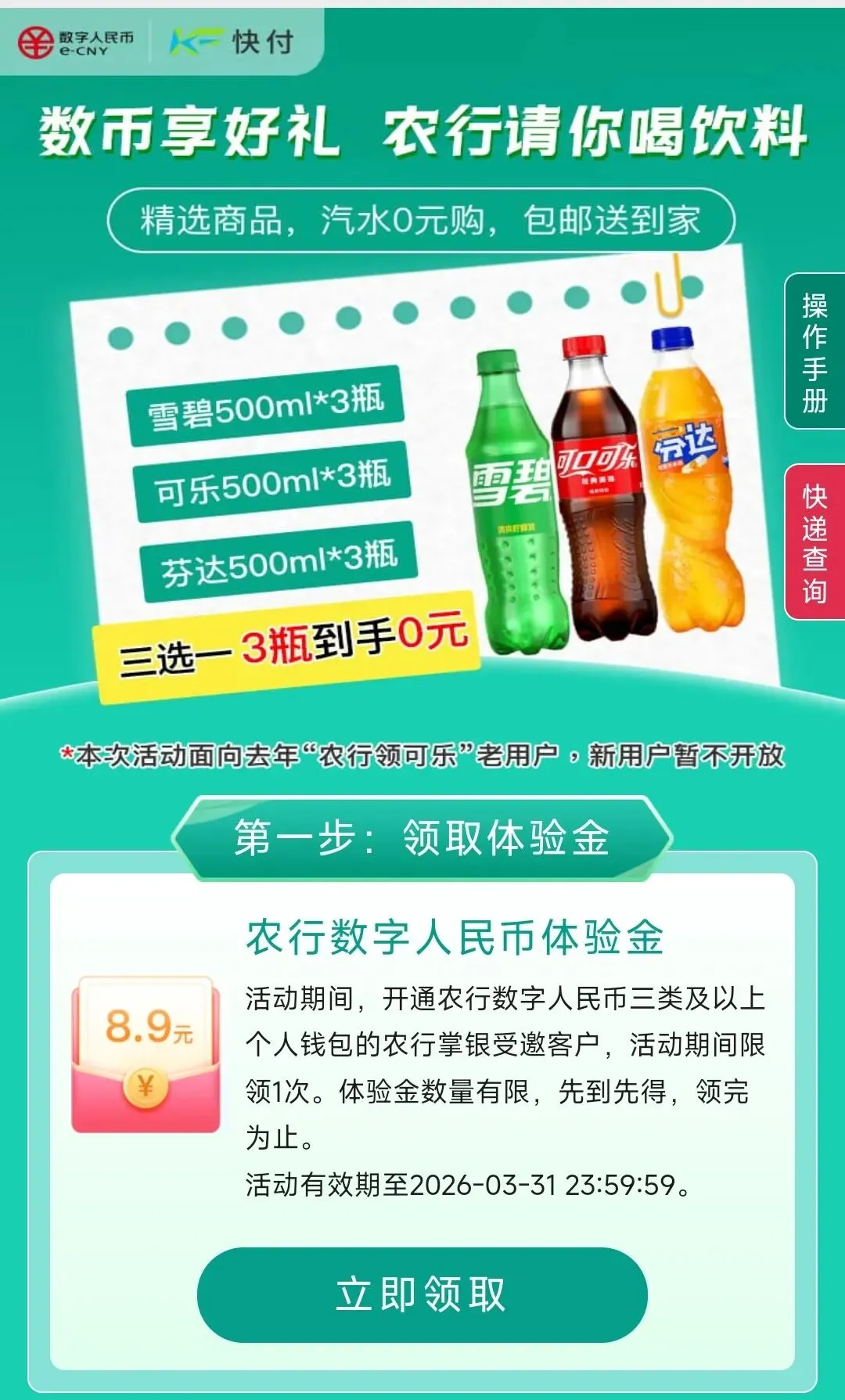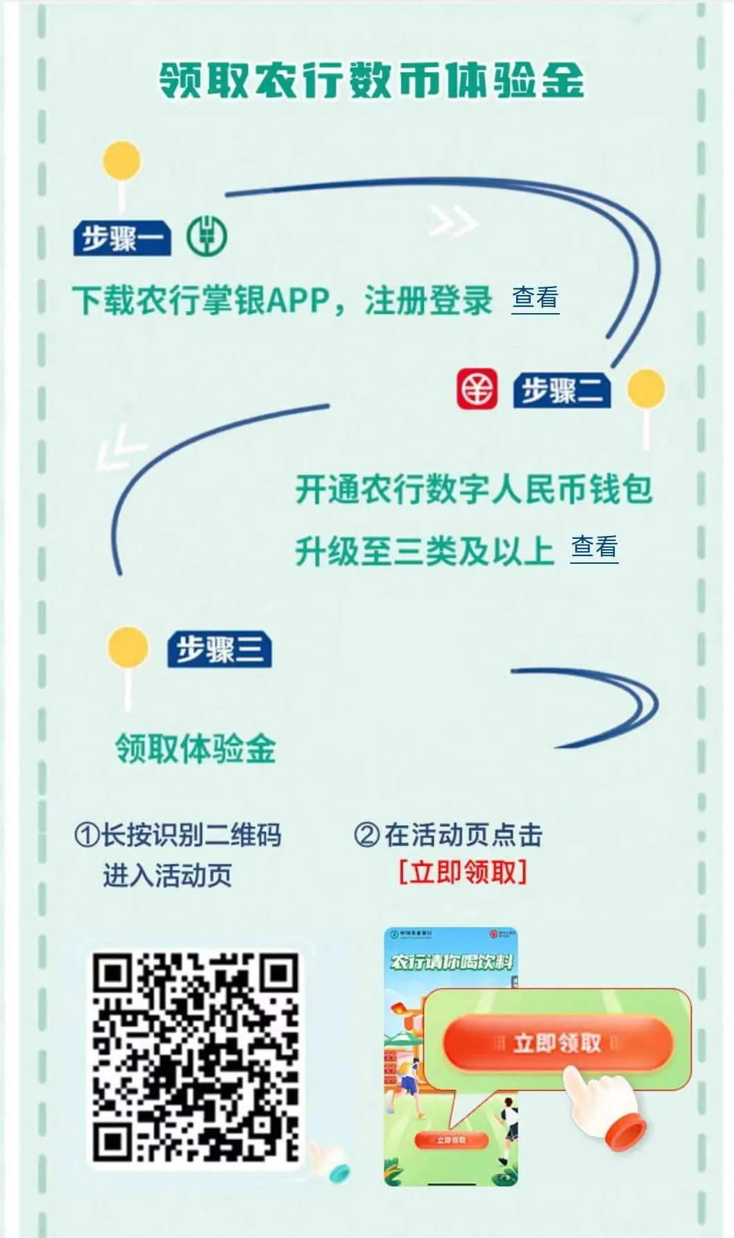 活动内容:活动期间,开通农行数字人民币三类及以上个人钱包的农行掌银受邀客户,通过扫描活动二维码领取1份8.9元数字人民币体验金,客户在活动指定场景使用农行数币钱包支付时自动抵扣,同一客户限领一次,数字人民币体验金有效期至3月31日23:59:59,数量有限,先到先得。活动期间仅限每位邀约客户享受一次。