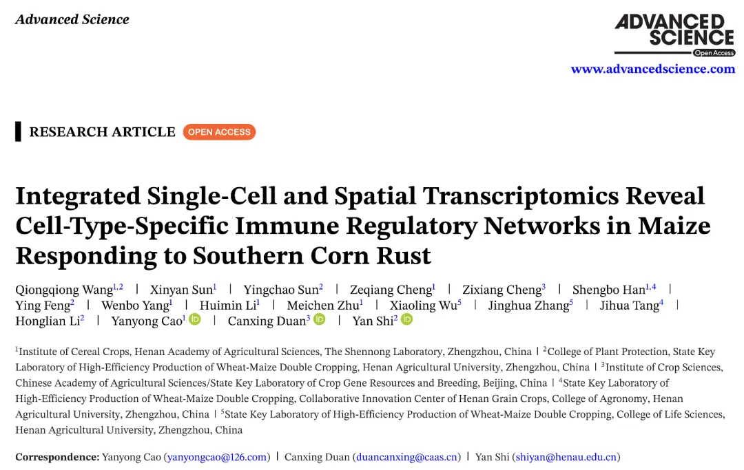 近日,我院粮食作物研究所曹言勇团队联合河南农业大学植物保护学院施艳团队、中国农业科学院作物科学研究所段灿星团队在国际权威综合性学术期刊Advanced Science(中科院一区TOP期刊,5年平均影响因子15.6)在线发表题为“Integrated Single-Cell and Spatial Transcriptomics Reveal Cell-Type- Specific Immune Regulatory Networks in Maize Responding to Southern Corn Rust”的研究论文,该研究整合单细胞核转录组和空间转录组技术,构建了玉米应答南方锈病侵染早期的高分辨率时空转录图谱。首次系统描绘了8种主要叶片细胞类型在病原菌侵染过程中的转录动态,揭示了表皮细胞和叶肉细胞在早期免疫中的核心作用,并明确了不同细胞类型在免疫响应中的功能分工。并挖掘出了ZmXET1和ZmRBG为玉米防御南方锈病的关键基因,为抗病育种提供了有价值的靶点。