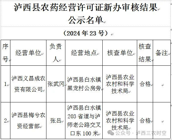 根据《农药管理条例》、《农药经营许可证管理办法》和《云南省农药经营许可实施办法》等规定,下列农药经营许可申请者通过我局农药经营许可审核小组材料审查和实地核查,符合农药(限制使用农药除外)经营许可证新办条件,现予以公示。本公示(公示期7天),时间2024年12月5日至2024年12月13日(双休日除外)。公示期间,如有异议,欢迎广大人民群众实名举报。