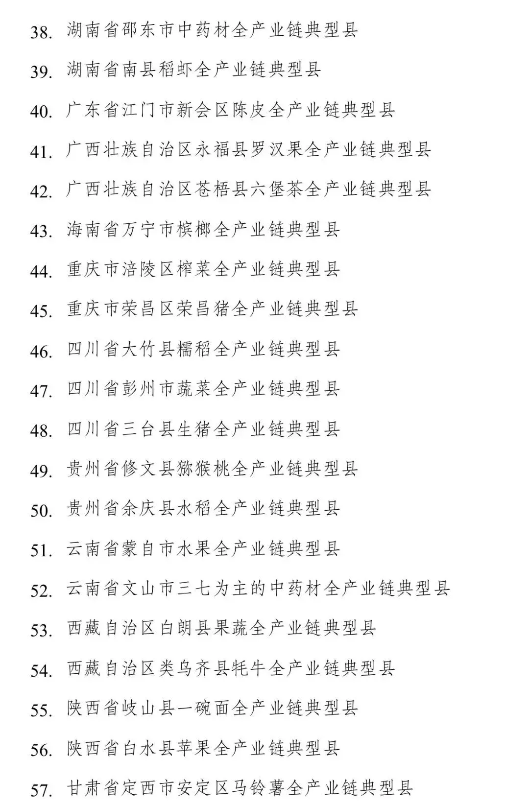 全国农业全产业链重点链建设名单
