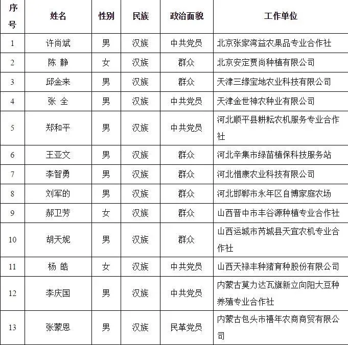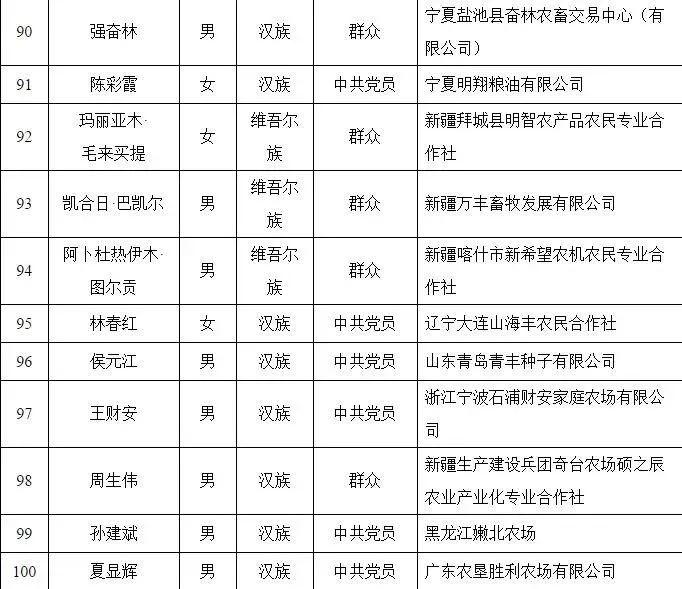各省、自治区、直辖市及计划单列市农业农村(农牧)、畜牧兽医、海洋渔业厅(局、委),新疆生产建设兵团农业农村局,北大荒农垦集团有限公司、广东省农垦总局:提升粮食和重要农产品供给保障能力是加快推进农业农村现代化的重要任务。为促进各地加强粮食和重要农产品生产管理和技术培训,我部依托高素质农民培育计划,培养了一大批生产经营理念先进、增收致富能力强的农业产业发展带头人,在保障粮食和重要农产品供给方面发挥了重要作用。2021年度农民教育培训“百名优秀学员”资助项目聚焦稳产保供,从近几年农民教育培训学员中,遴选100名保障国家粮食安全和重要农产品有效供给的先锋人物(以下简称“百优保供先锋”),展示他们在发展产业、保障农产品供给、带动农民增收等方面的积极成效,激励更多高素质农民投身乡村振兴。经过各地推荐、组织遴选、社会公示等环节,我部决定对许尚斌等100名农民教育培训“百优保供先锋”给予资助,现将名单予以公布。希望受资助的“百名保供先锋”再接再厉,加强学习,提升能力水平,发挥示范带动作用,继续为加快推进农业农村现代化贡献力量。各级农业农村部门要广泛宣传“百名保供先锋”典型事迹,弘扬他们的创业奉献精神,进一步完善农民教育培训制度和政策措施,大力培养有文化、懂技术、善经营、会管理的高素质农民队伍,为实施乡村振兴战略提供坚实人才支撑。附件:2021年度农民教育培训“百优保供先锋”资助项目人选名单 农业农村部办公厅
