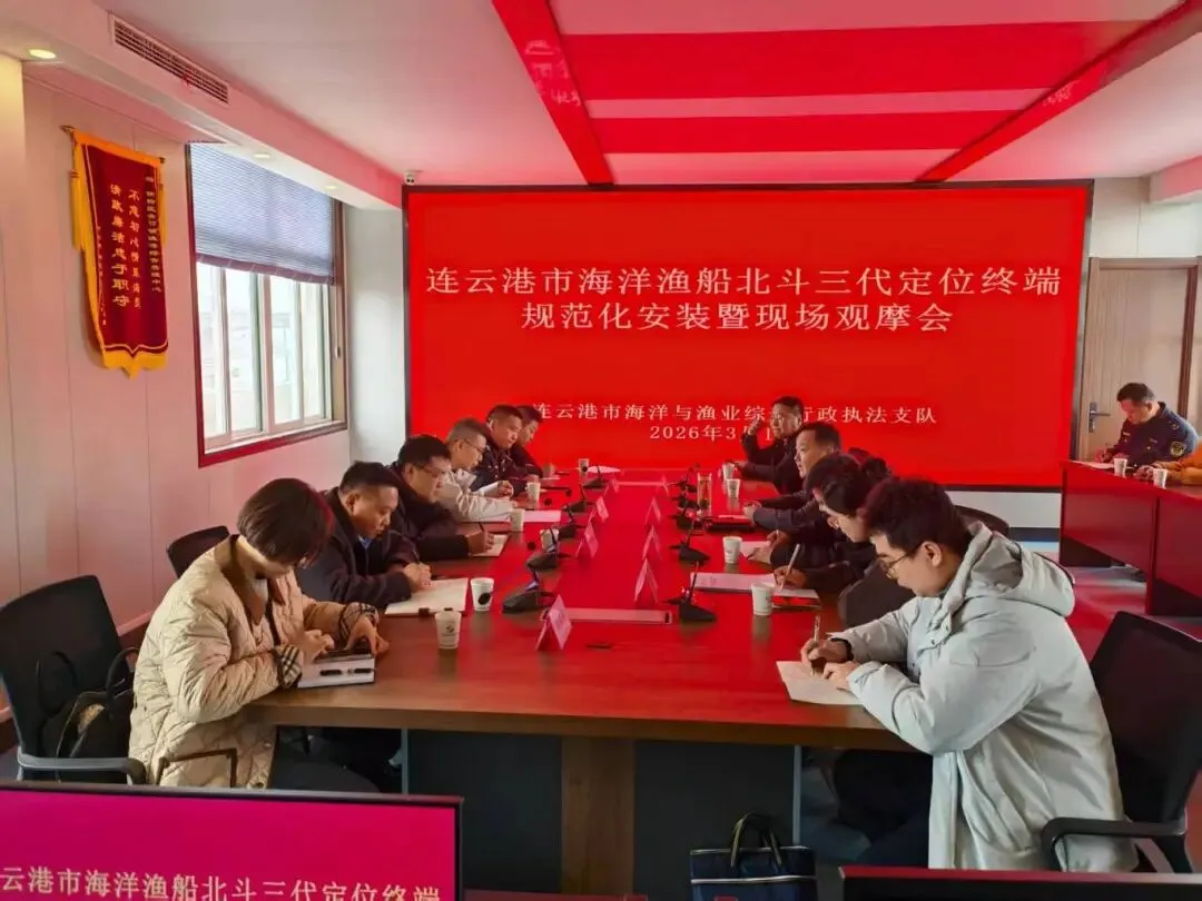 为加快推进海洋渔船船载北斗三代定位终端项目建设,全面规范终端安装调试流程,3月17日,市海洋与渔业综合行政执法支队在赣榆区召开北斗三代船载定位终端规范化安装暨现场观摩会。省渔业安全应急中心有关负责同志、市支队负责人、各县区负责人以及北京北斗星通信息服务有限公司连云港地区负责人参会。