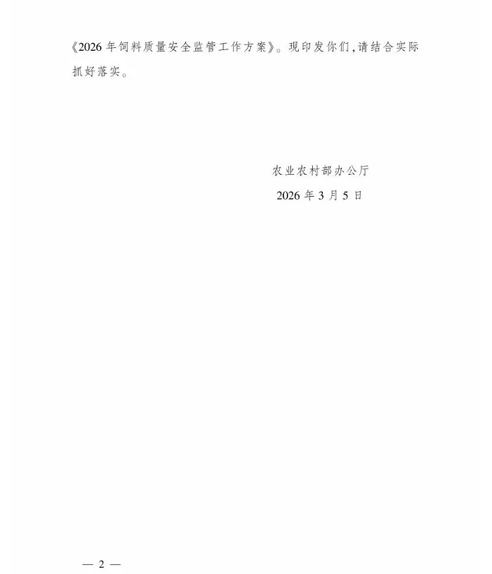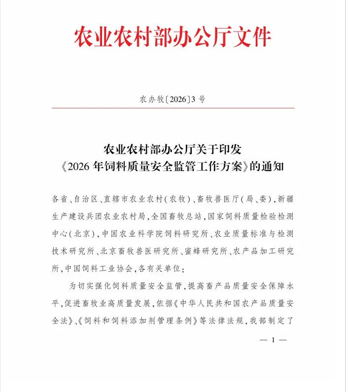 农业农村部办公厅关于印发《2026年饲料质量安全监管工作方案》的通知 (农办牧〔2026〕3号)