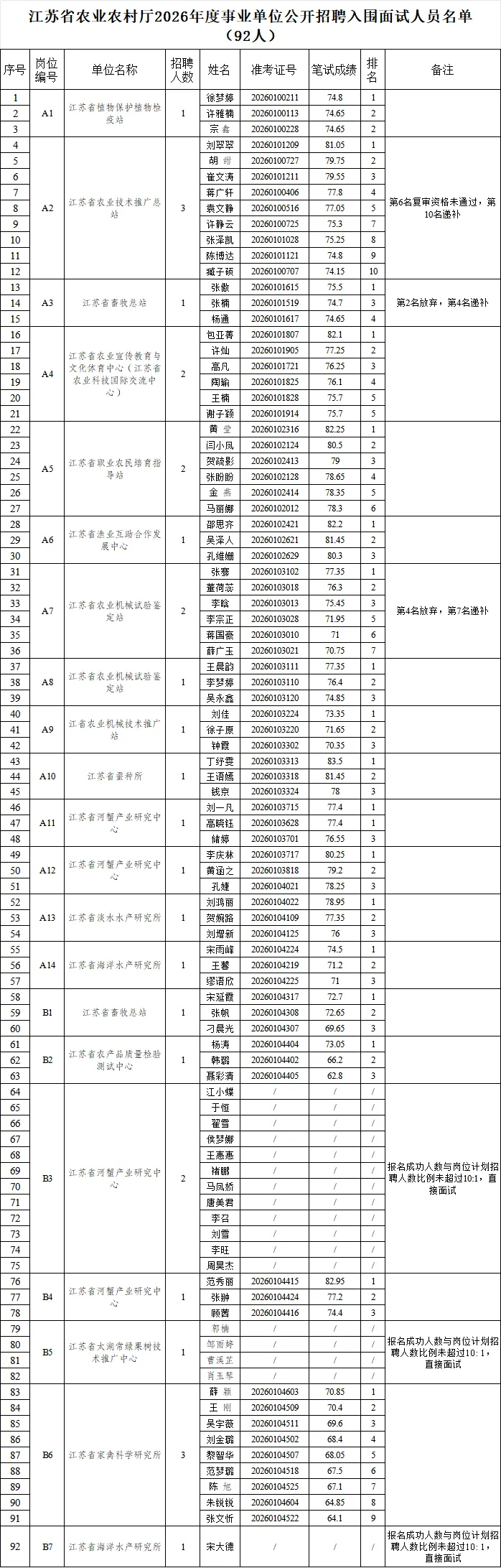 根据《江苏省农业农村厅直属事业单位2026年公开招聘工作人员公告》,21个岗位共92名考生通过资格复审,现将入围面试人员名单予以公告。