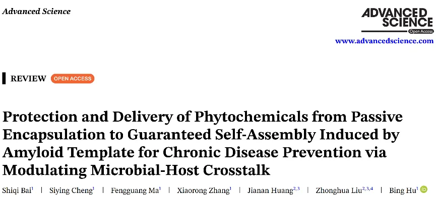 近日,南京农业大学食品科技学院胡冰教授团队在国际权威期刊《Advanced Science》发表了题为“Protection and Delivery of Phytochemicals from Passive Encapsulation to Guaranteed Self-Assembly Induced by Amyloid Template for Chronic Disease Prevention via Modulating Microbial-Host Crosstalk”的综述论文。针对现代“药食同源”食品配方中植物功能成分负载量难以提高,进而导致经口生物可及度和生物利用率不高,体内预防慢性病功能不强的共性问题,团队基于最近10年的研究工作,提出了从被动包埋到可控分子组装的现代“药食同源”食品配方新策略,以达到调控“宿主-菌群”互作的精准营养干预目的。