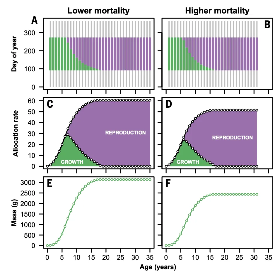 模型清晰展示了死亡率如何重塑鱼类的最优生活史。在低死亡率条件下,鱼类将更长时间的资源投入生长,较晚才开始繁殖,最终达到较大的体型。当死亡率升高时,最优策略发生转变:个体提前将资源从生长切换到繁殖,更早成熟但体型更小。