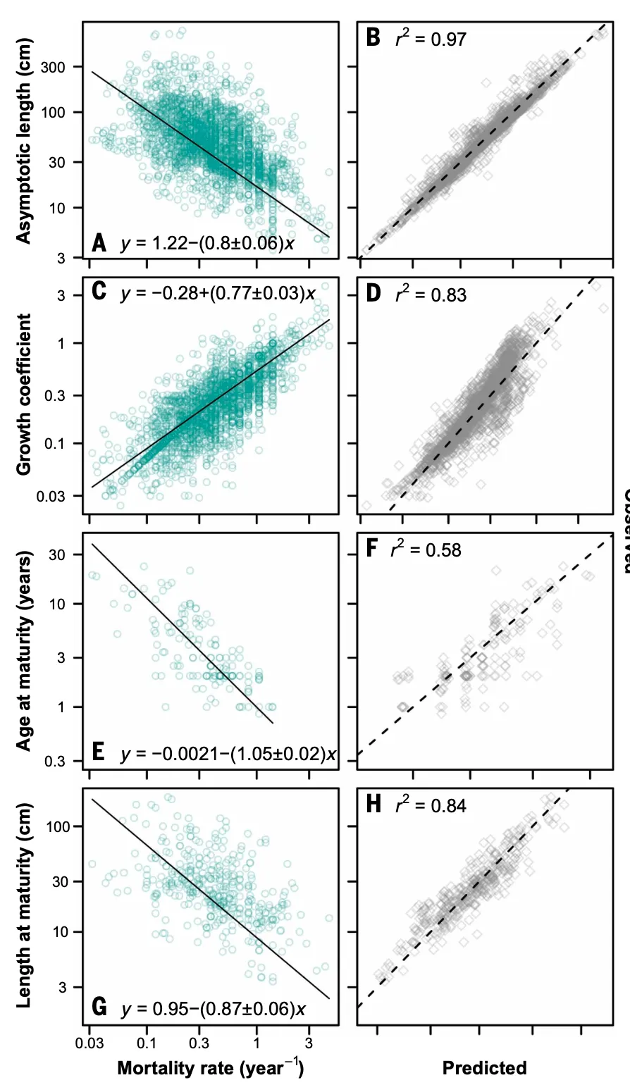 将模型预测与FishBase中近3000种鱼类的实际观测数据对比,结果令人印象深刻:模型仅凭死亡率这一个变量,就解释了渐近体长97%、von Bertalanffy生长系数83%、性成熟年龄58%、性成熟体长84%的种间变异。