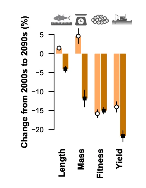 在中等排放情景(SSP2-4.5,升温约2°C)下,如果鱼类不发生进化适应,升温导致的生长加速和死亡率升高将使鱼类繁殖力下降约16%,渔业产量下降约14%。
