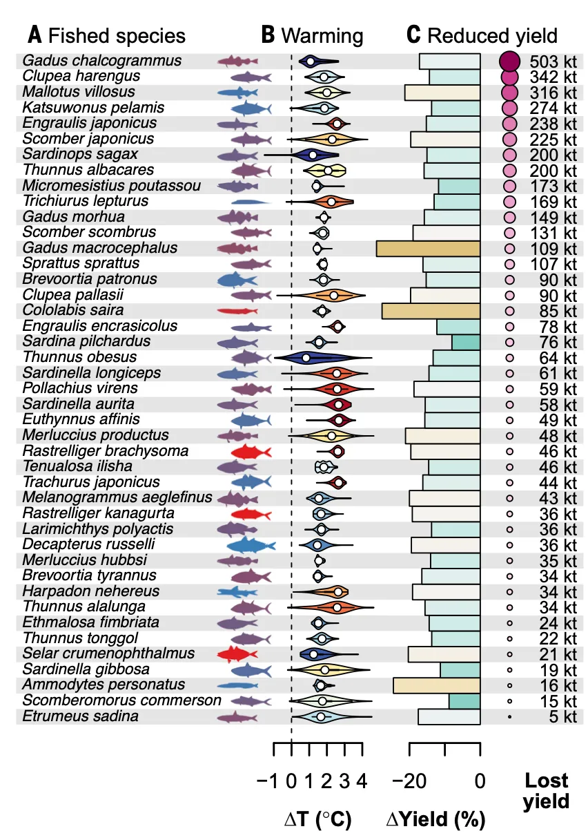对43个全球主要渔业物种的逐物种分析显示,经历升温幅度越大的物种,生活史进化调整越剧烈,渔业产量损失也越严重。以阿拉斯加鳕(walleye pollock)为例,该物种占2022年全球渔获量的3.6%,预计经历约2.7°C升温后,最大体重将进化缩小12%,渔业产量下降约17%,相当于每年损失约50万吨。