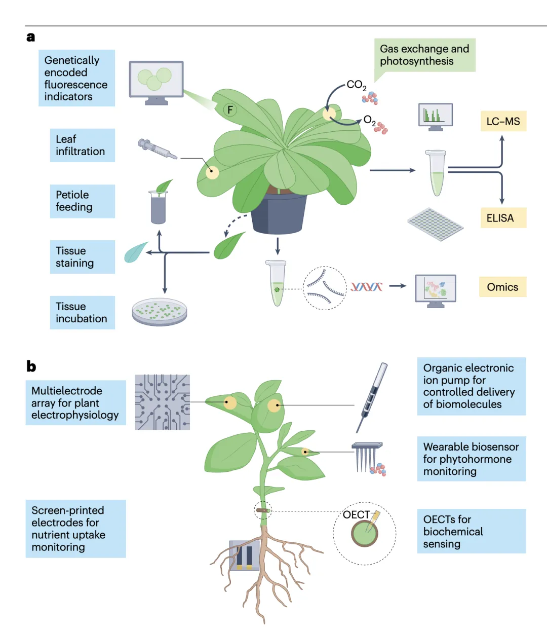 图 1 | 植物基础研究中的传统工具与生物电子技术对比