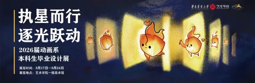 执星而行,逐光跃动。华南农业大学艺术学院动画系2026届本科毕业设计展诚挚邀请您的莅临指导,期待与您一同见证年轻的动画“锄垦人”用四年的光阴,在这片名为“动画”的土地上,一帧一帧耕种出属于这个时代的艺术果实,见证人与智能技术共舞的时代,动画如何生长,梦想如何发光。
