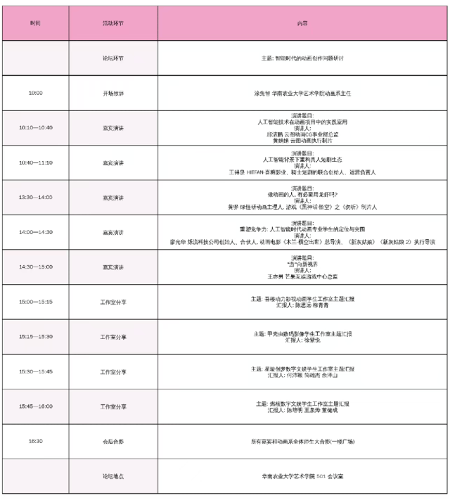 我们深知,动画的成长需要沃土,更需要师友的扶持与见证。诚邀您在展览期间参加“毕业嘉年华”主题活动,围绕当前行业发展中的智能动画创作相关议题开展分享与交流。您的到来,将是对这群年轻创作者最大的鼓励,也是对华农动画专业发展的莫大支持。
