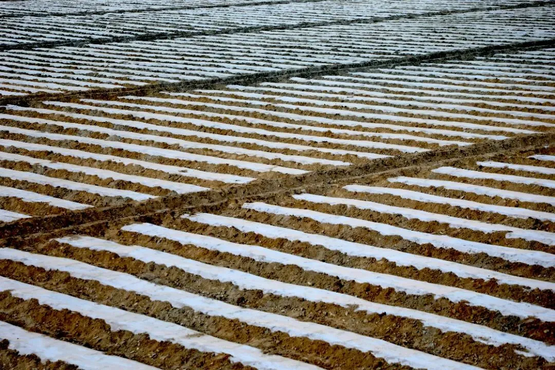▲整齐的地膜在田间铺展,为新一季作物积蓄温度。